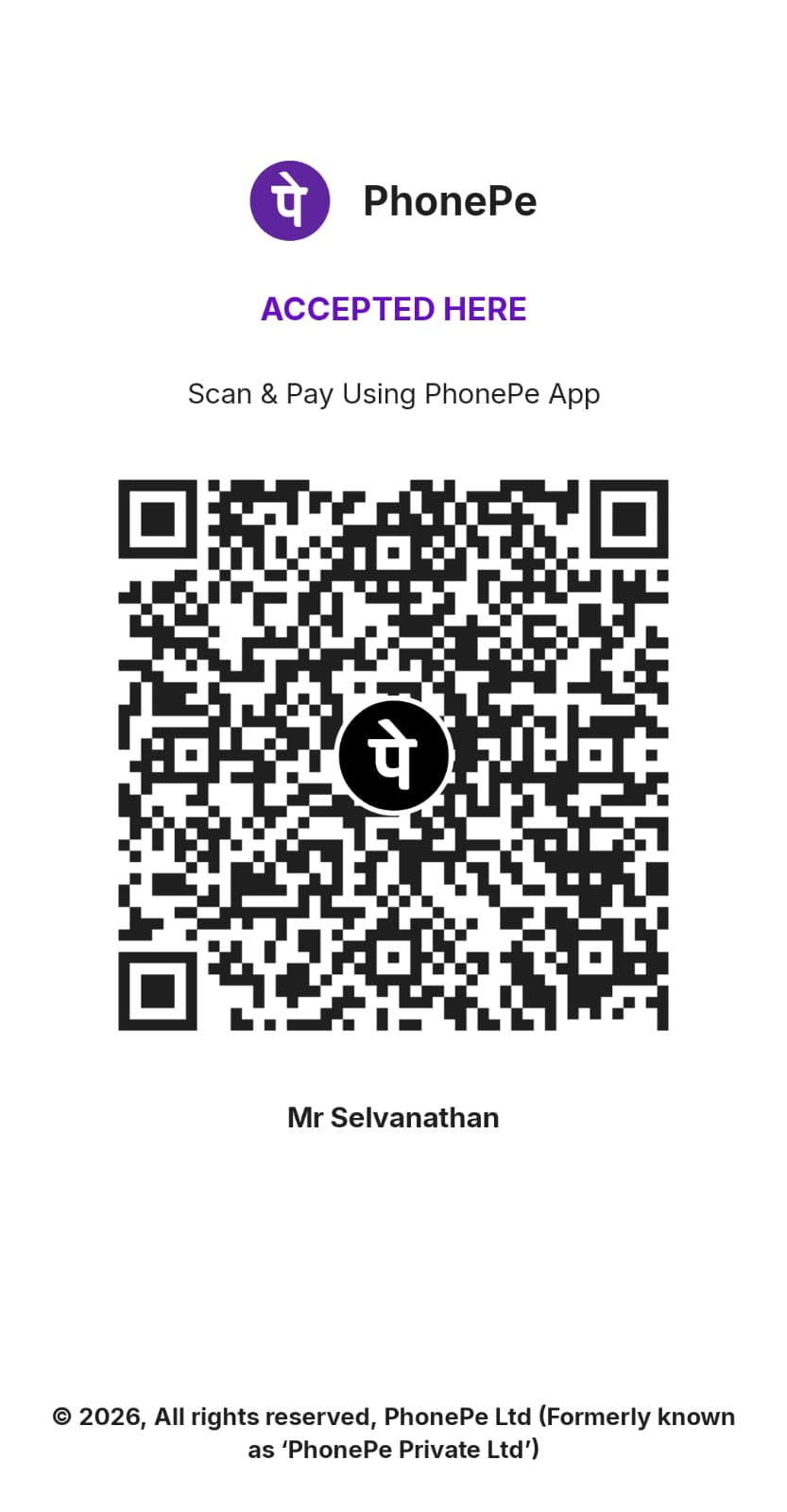 | AC | Selvanathan | Bank | Central Co-operative Bank | A/C No | 711012831 | Branch | Palayamkottai | IFSC Code | TNSC0011500 |